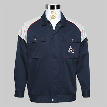 正面圖片  深藍與白色撞色設計,簡潔大方,大面積深色更耐臟實用。插肩袖設計,更符合適合運動量大的工作人員要求。
